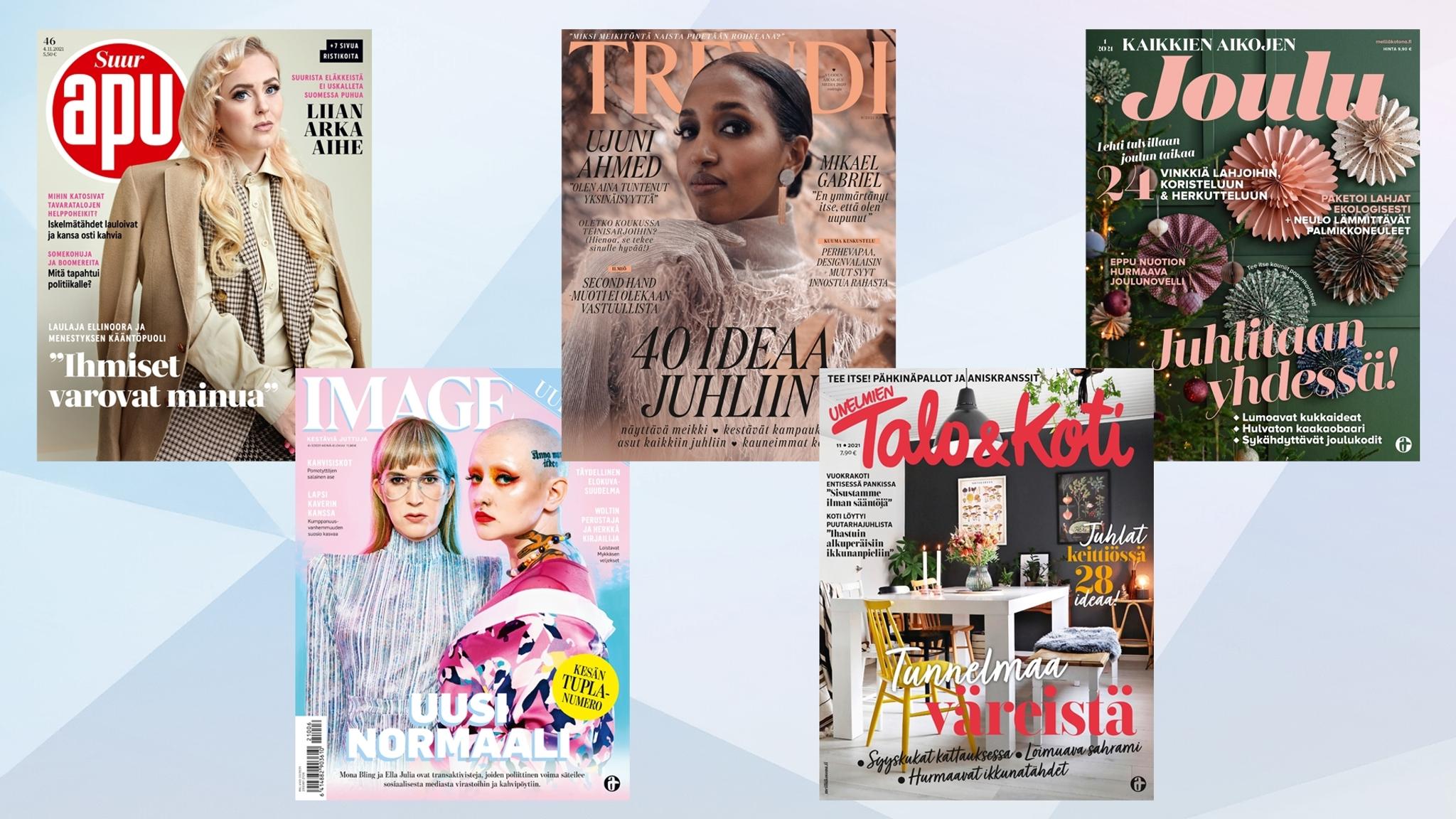 Avun, Imagen, Trendin sekä Kaikkien aikojen Joulu ja Unelmien Talo&Koti -lehtien kannet on valittu Aikakausmedian Editkilpailun Vuoden 2021 kansi -ehdokkaiksi.