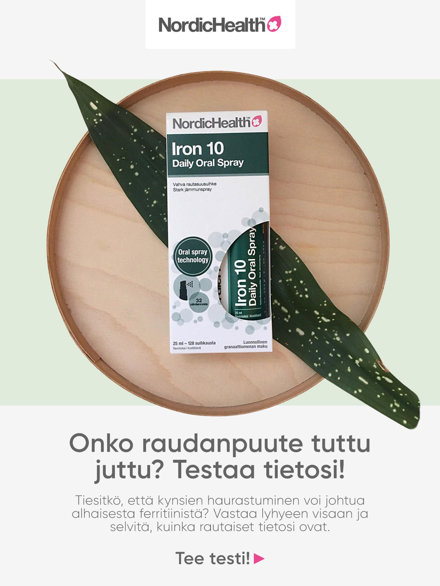 Midsonan valikoimaan kuuluva Nordic Health Iron10 on vahva rautasuusuihke, joka on nopea, helppo ja tehokas käyttää. Neljä suihkausta päivässä posken limakalvolle riittää. Suihke sopii raskaana oleville, imettäjille, vegaaneille, diabeetikoille, keliaakikoille ja ketogeeniseen ruokavalioon. Suihke on helppo tapa nauttia rautaa myös niille, joille pillereiden nieleminen on hankalaa.